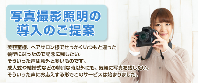 ヘアサロン内で写真撮影、動画撮影が可能になる画期的なシステムです。成人式、各種お祝い事の際の記念写真撮影、ヘアカタログ撮影等美容師さんがカメラマンとして撮影することができます。撮影機材も簡単に扱えるよう丁寧にレクチャーいたします。インスタグラム等での集客も必須となってきております。ぜひ撮影機材、LED撮影照明を導入検討下さいませ。撮影機材を超割価格で提供!初心者でも安心。プロ並みの商品写真が誰でも簡単に。撮影機材に関するご相談いつでもお気軽に。まずはお電話で!! 撮影経験豊富なスタッフが親切丁寧にご対応いたします。