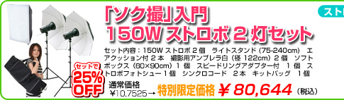 撮影機材を超割価格で提供!初心者でも安心。プロ並みの写真撮影が誰でも簡単に。一眼レフデジカメ使用の撮影用機材に関するご相談いつでもお気軽に。まずはお電話で!! 撮影経験豊富なスタッフが親切丁寧にご対応いたします。広告写真撮影の現場はモノブロックストロボフラッシュが主流です。コストパフォーマンス・耐久性に優れた撮影照明です。お手持ちの一眼レフカメラで大量の商品撮影を可能にしたい方、プロの撮影現場ノウハウを凝縮し、より使いやすく簡単な商品撮影機材のストロボセットを厳選しました。ウェブショップの商品撮影用の画像撮影等で大量の商品撮影にお困りの方、効率の良いストロボ照明をぜひ検討して下さい。大量の商品撮影モデル撮影にはモノブロックストロボの使用が必須です。ぜひこの機会にモノブロックストロボを導入検討下さいませ。